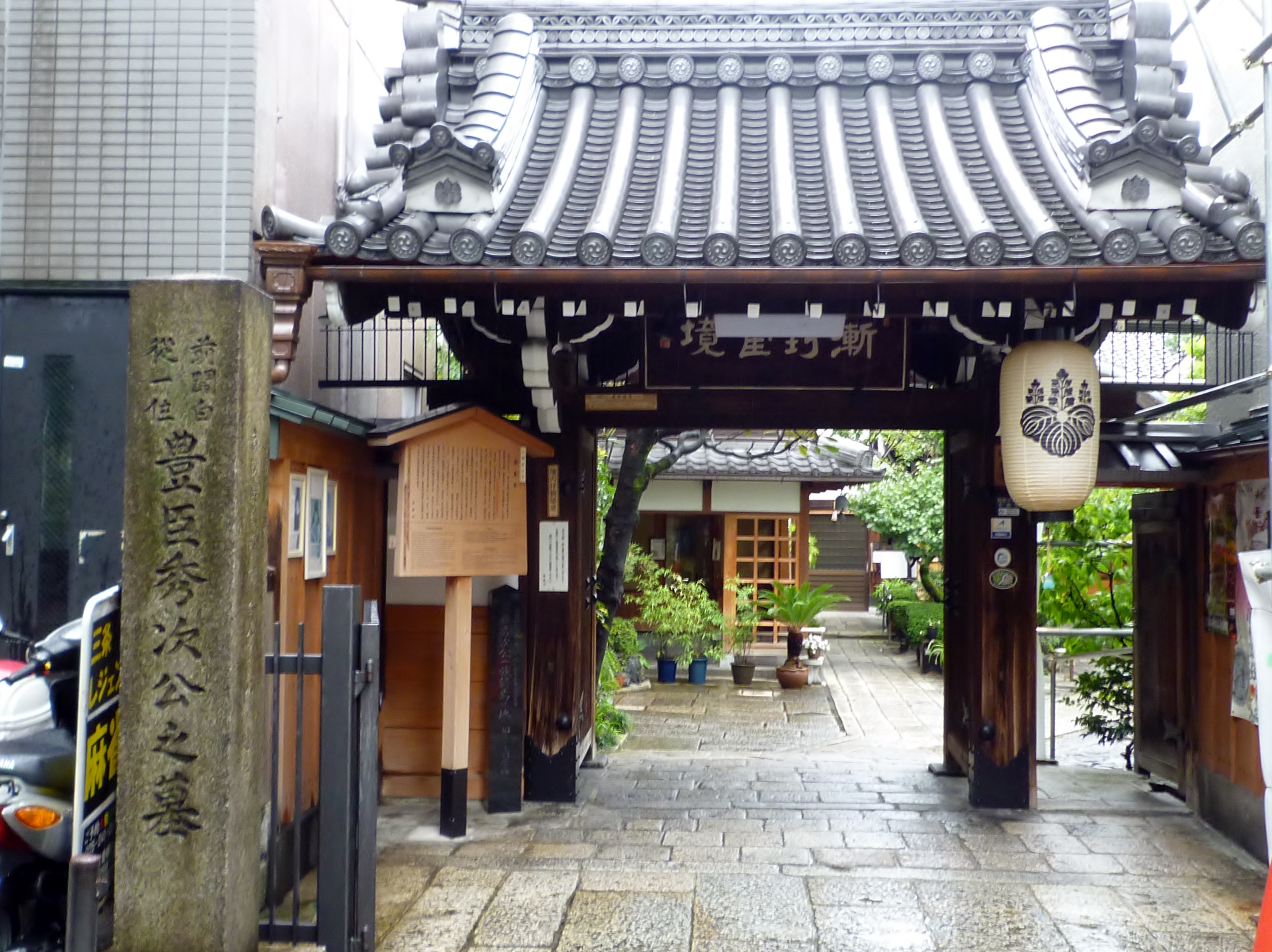 山門の前には「豊臣秀次公之墓」と、そして豊臣家の家紋を描いた提灯が下げられている。